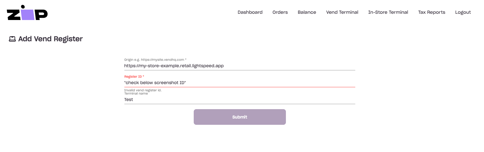 Once you’re logged in on the Zip Merchant Portal, select Vend Terminal to register a Vend Terminal